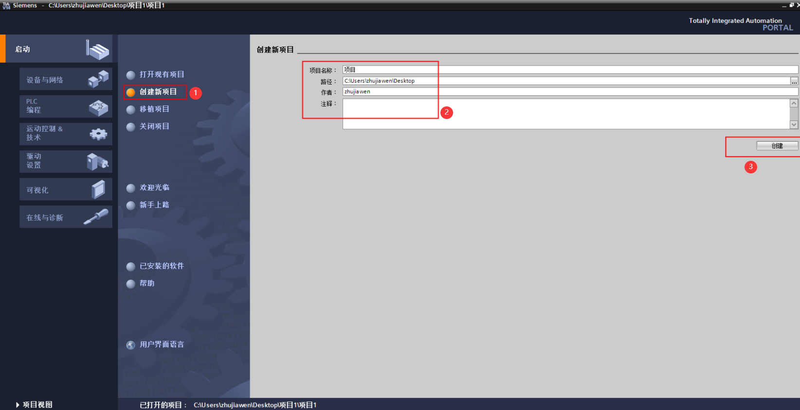 新建工程打開 TIA Portal 軟件,選擇“創(chuàng)建新項目”,并填寫項目名稱、路徑、版本、作者等相關信息,點擊創(chuàng)建: