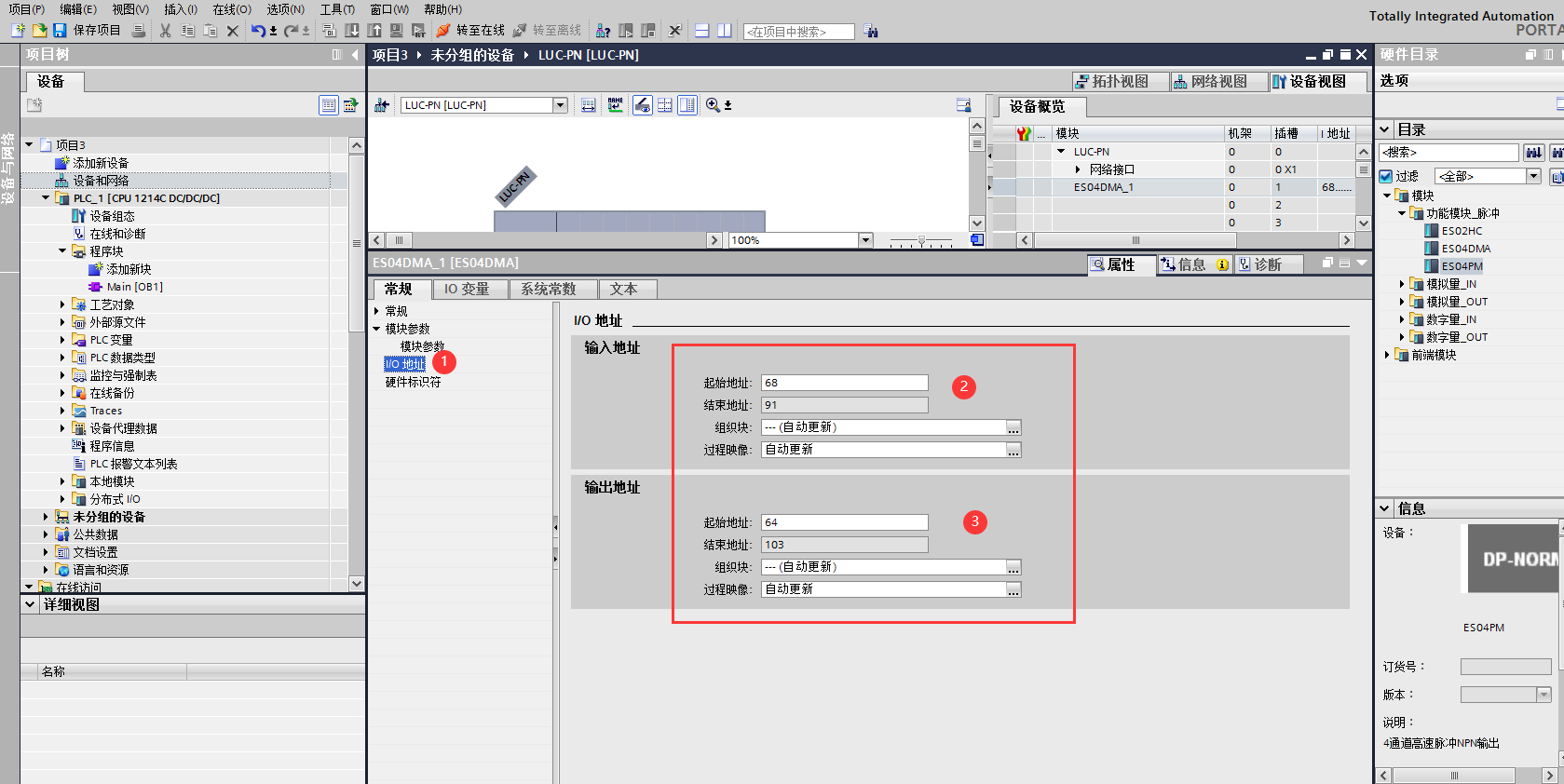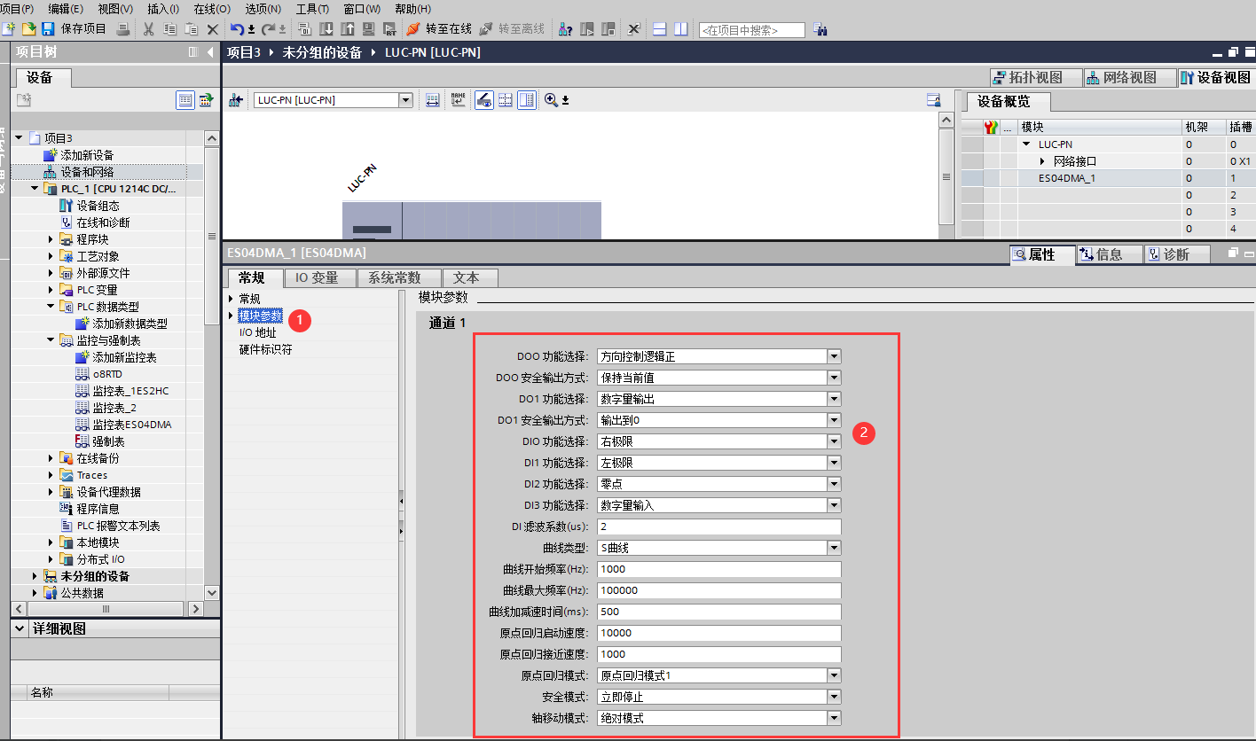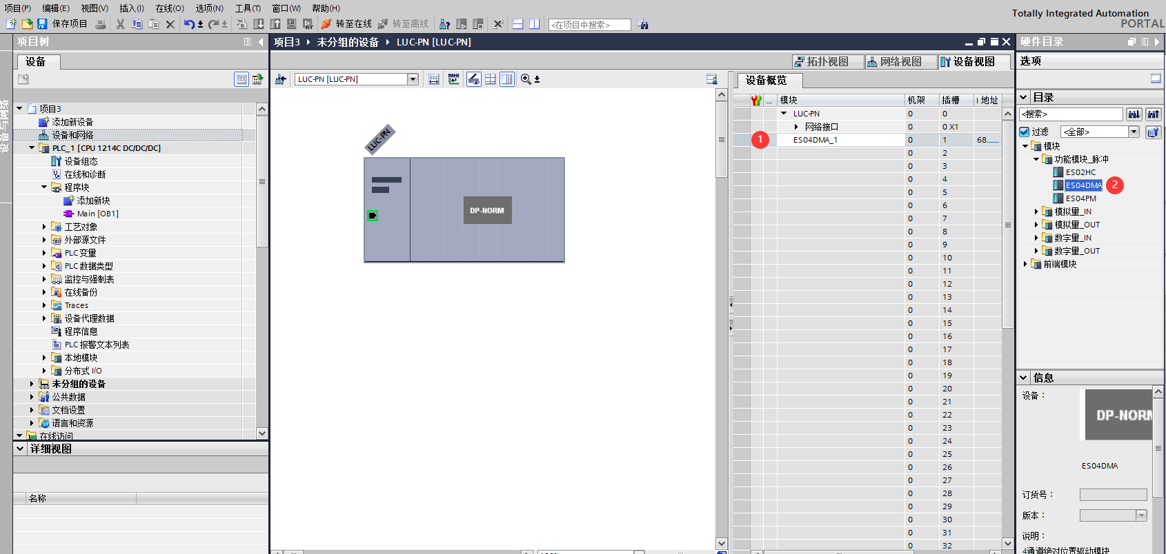 添加ES-04DMA硬件。雙擊后TIA Portal軟件右上角區(qū)域會出現(xiàn)LUC-PN擴展模塊的信息。先選中插槽1,再選擇“功能模塊_脈沖”再雙擊ES04DMA。