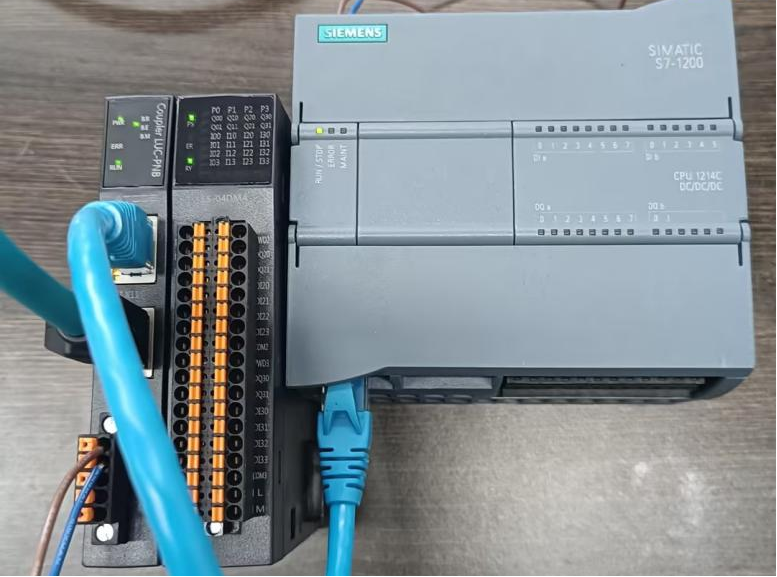 S7-1200PLC與遠程IO模塊電源,將測試對象PLC的網口, 通過網線插入到遠程IO模塊的X1口, 后將遠程IO模塊的X2 口通過網線接入到調試電腦網口上。