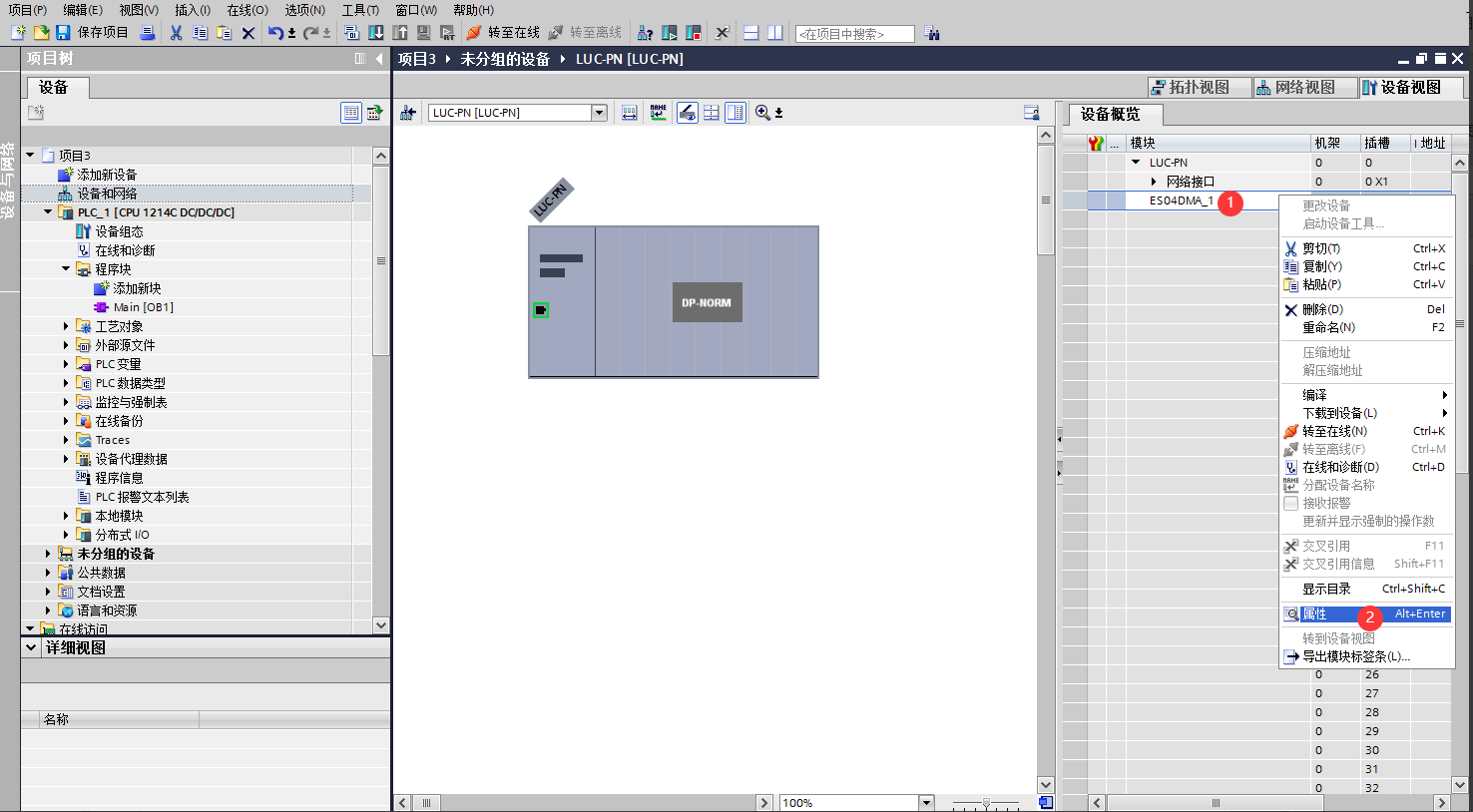 添加LUC-PN模塊。選擇中間界面的“網絡視圖”,在右側硬件目錄找到“LUC-PN” 拖拽到左側網絡視圖,并設置IP地址: