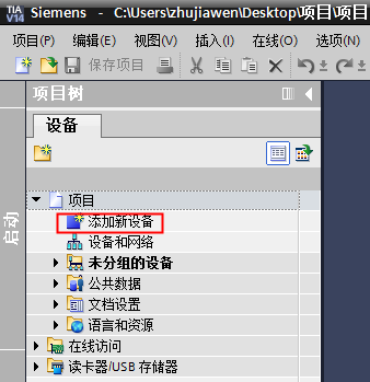 CPU的添加與連接。點擊界面左邊的“項目”,出現(xiàn)下級目錄,并雙擊“添加新設備”: